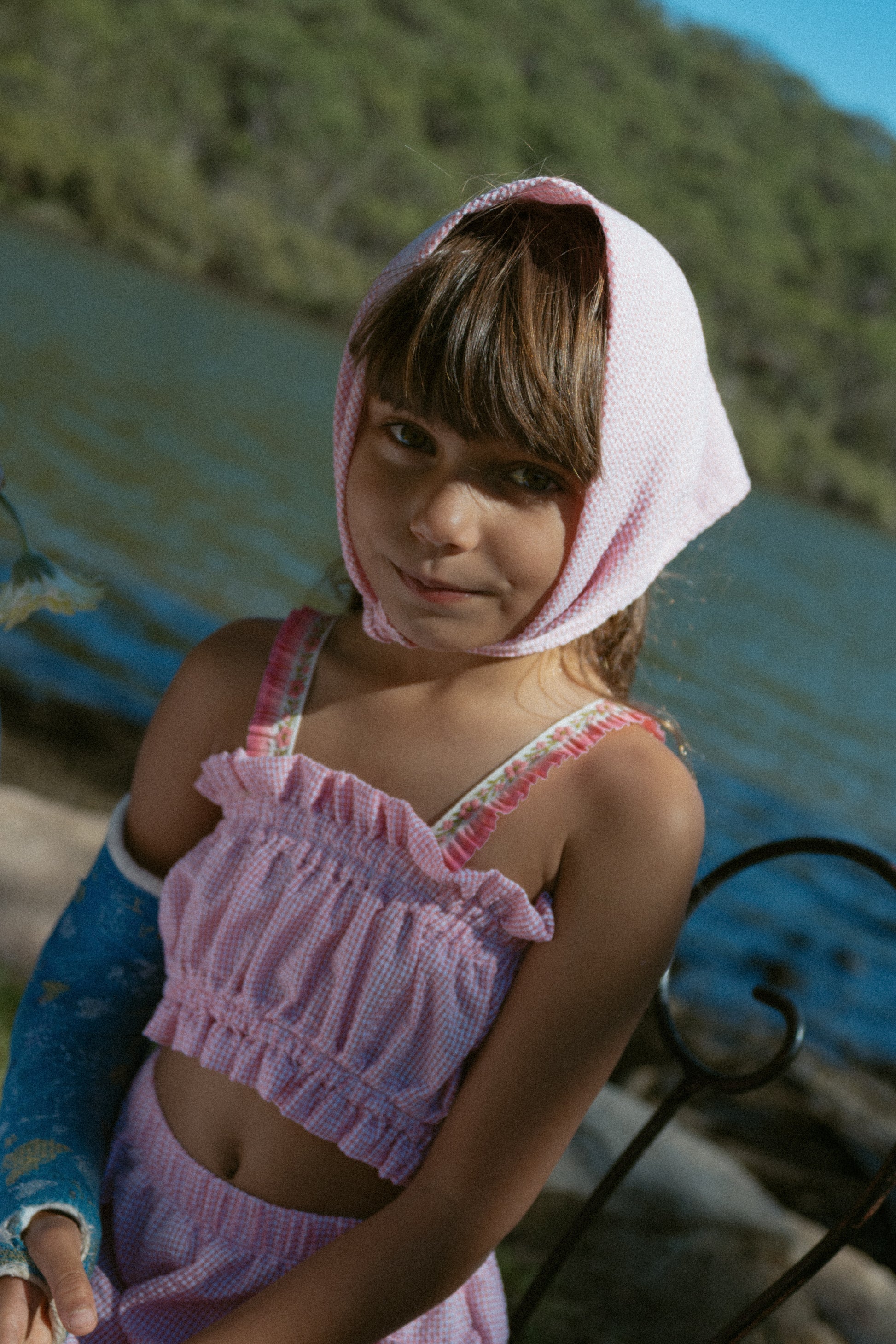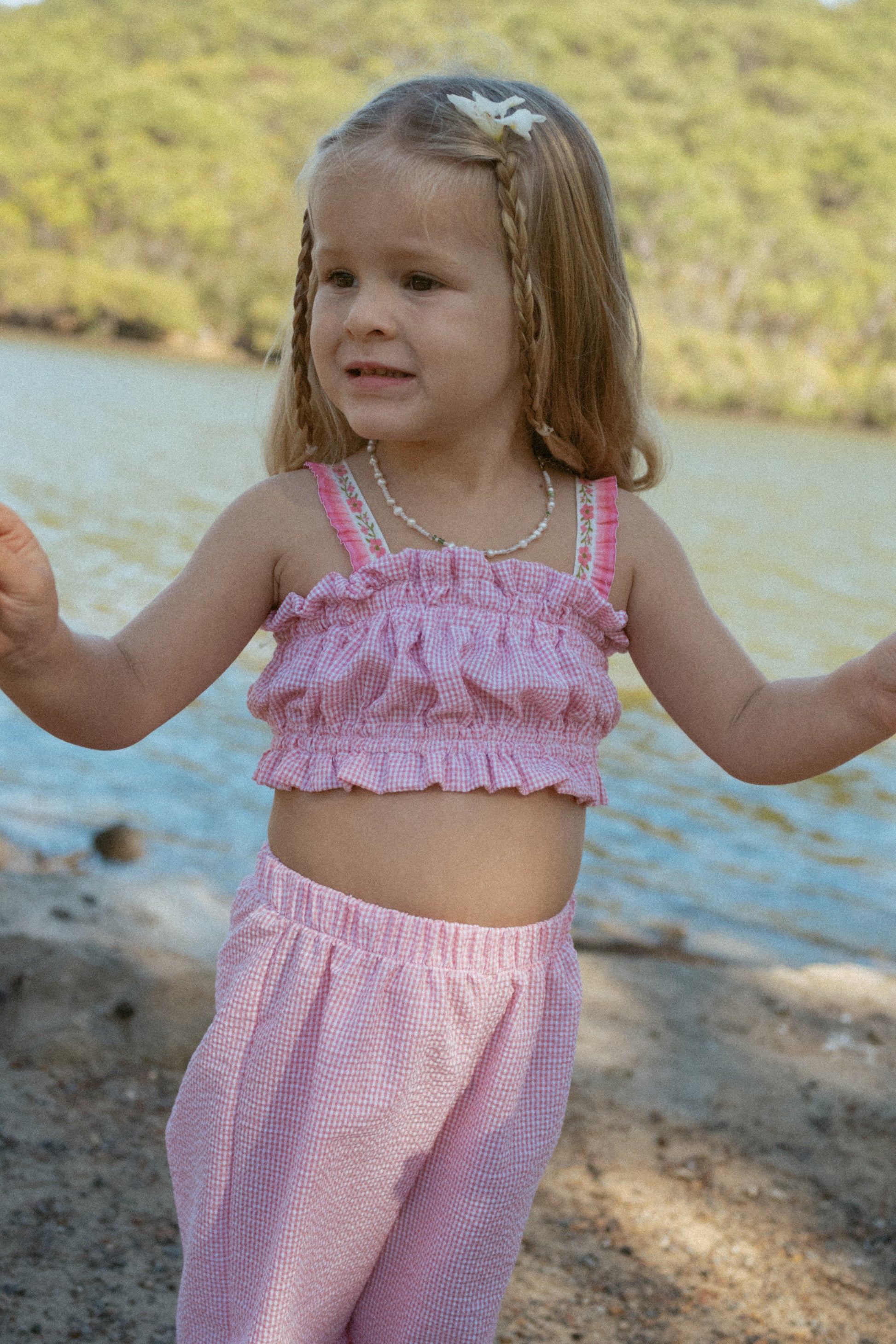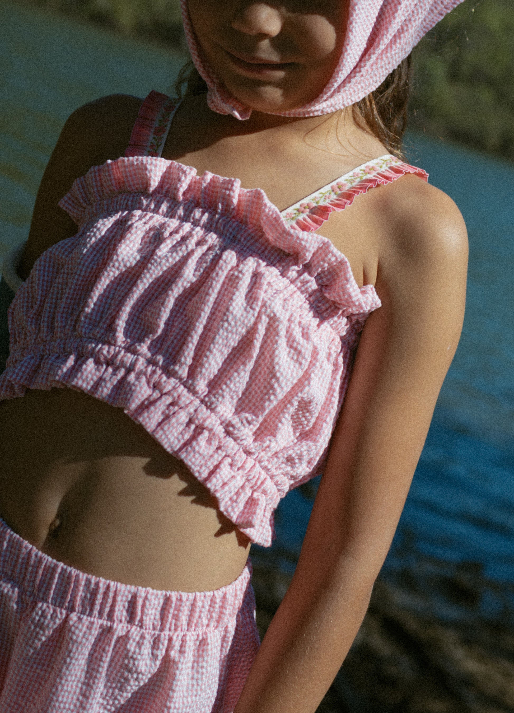 - Gorgeous little two piece set in pink and white mini gingham seersucker fabric