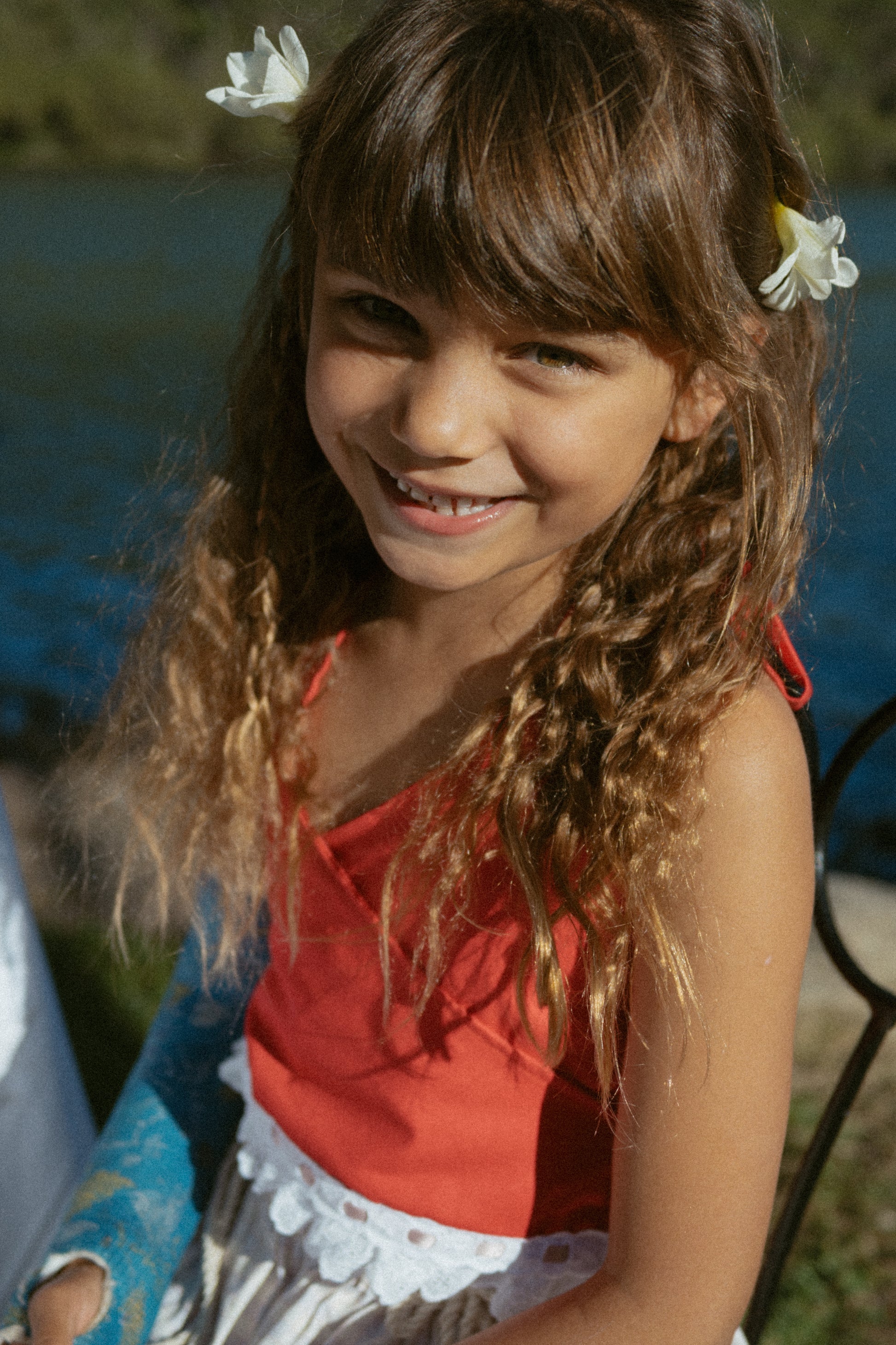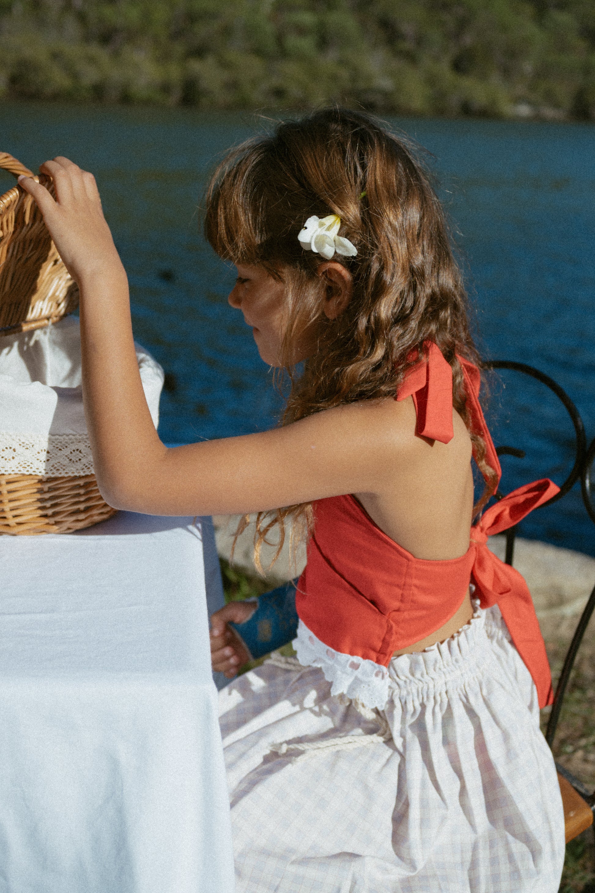 - Halter top in red with white broderie anglaise trim with pale pink insert ribbon